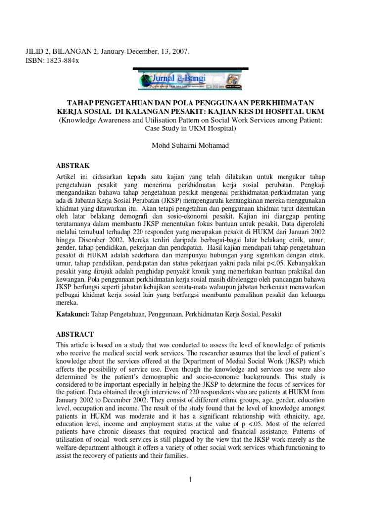Tahap Pengetahuan Dan Pola Penggunaan Perkhidmatankerja Sosial Di Kalangan Pesakit Kajian Kes Di Hospital Ukm