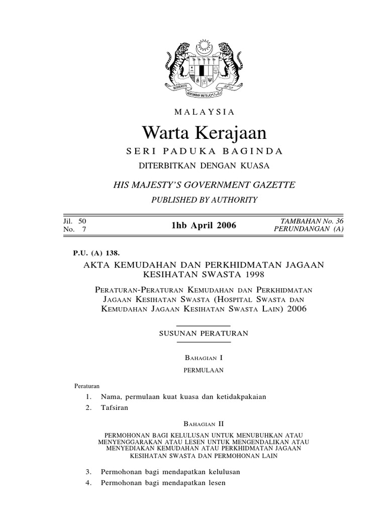 Private Healthcare Facilities And Services Act 1998 Act 586 Regulations Order