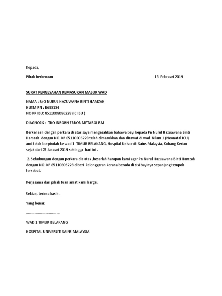 Perkara 13 14 i ii. 15042020 Homepage contoh surat pengesahan masuk wad hospital. Contoh Surat Pengesahan Masuk Hospital have a graphic associated with the otherContoh Surat Pengesahan Masuk Hospital It also will include a picture of a sort that may be seen in the gallery of Contoh Surat Pengesahan Masuk Hospital.